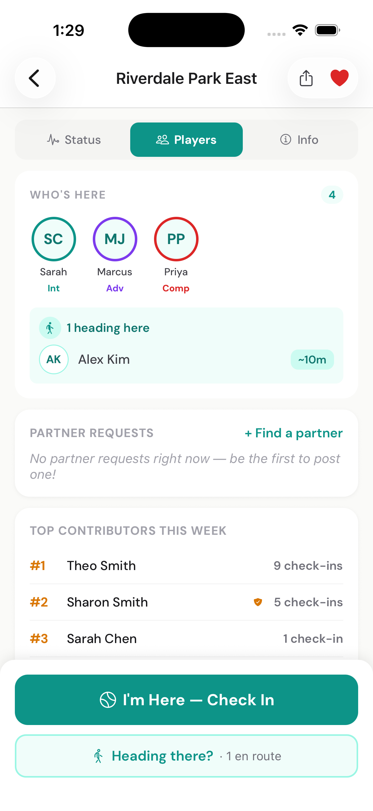 Find an empty court in seconds. Real players check in across Toronto so you always know where to play — before you leave the house.